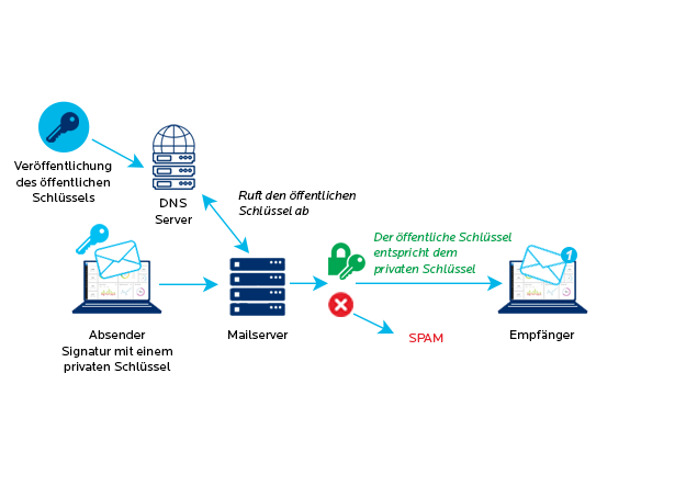 Der sendende Mailserver oder das System zum Versand von E-Mails (das ein Antispam-Programm sein kann, wenn die ausgehenden E-Mails durch ein Antispam-Programm geleitet werden) signiert die Nachrichten mit einem privaten Schlüssel, der mit der Domain des Senders verknüpft ist. Der öffentliche Schlüssel wird wiederum im DNS-Server veröffentlicht, damit er für alle zugänglich ist.