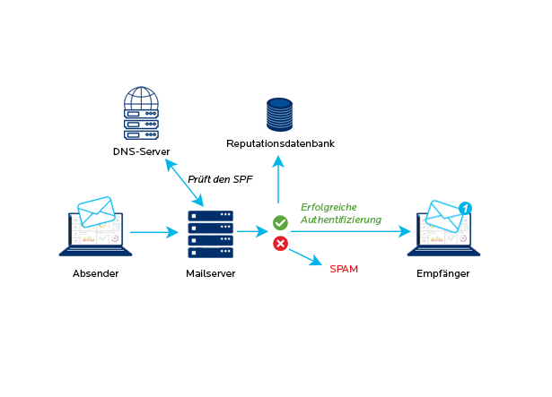 Mit SPF kann festgelegt werden, welche IP-Adressen berechtigt sind, E-Mails für eine bestimmte Domain zu senden, und somit wird verhindert, dass E-Mails mit Ihrer Domain als Absenderadresse von anderen Servern als Ihren eigenen versandt werden. Die IPs, die E-Mails für einen Domainnamen versenden dürfen, werden in einem DNS-TXT-Eintrag aufgelistet.