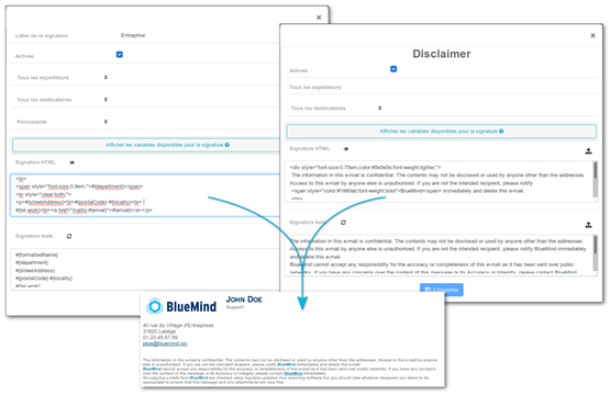 Neben E-Mail-Signaturen kann mit dieser neuen BlueMind-Anwendung auch die Eintragung eines Disclaimer verwaltet werden. Diese Meldung umfasst in der Regel eine Haftungsausschluss- und Vertraulichkeitsklausel, sie kann aber auch gesetzliche Pflichtvermerke, Werbeslogans usw. enthalten.