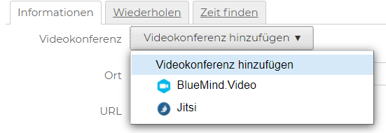 Sie wählen das gewünschte Videokonferenzsystem aus, wenn Sie einem Termin oder einem Meeting eine Videokonferenz hinzufügen.