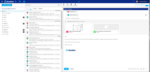 Der Webmailer bietet Ihnen alle BlueMind-Funktionen, damit Sie genauso effizient arbeiten können wie in einem Fat Client: angenehme, effiziente und schnelle Verwaltung Ihrer Mails, Ordner, geteilten und spezifischen Mailboxen sowie Ihrer Entwürfe, detaillierte Suchvorgänge, dazu die Verwaltung von Einladungen und die Suche nach verfügbaren Terminen im Kalender, die Verwaltung der E-Mail-Signaturen des Unternehmens, die Ressourcenverwaltung für Videokonferenzen, das automatische Abtrennen großer Anlagen, die Filter usw.