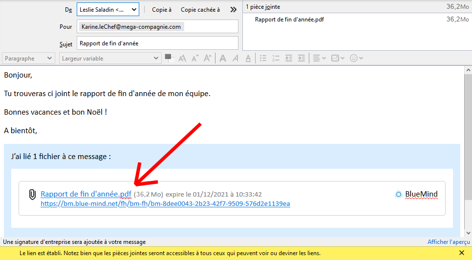 Ceci permet, en outre, d’envoyer des fichiers volumineux que la limite autorisée en pièce jointe d’un message ne permet pas. Dans l’exemple ci-dessus, le message aurait été automatiquement transformé en lien accessible à tous les destinataires du mail :