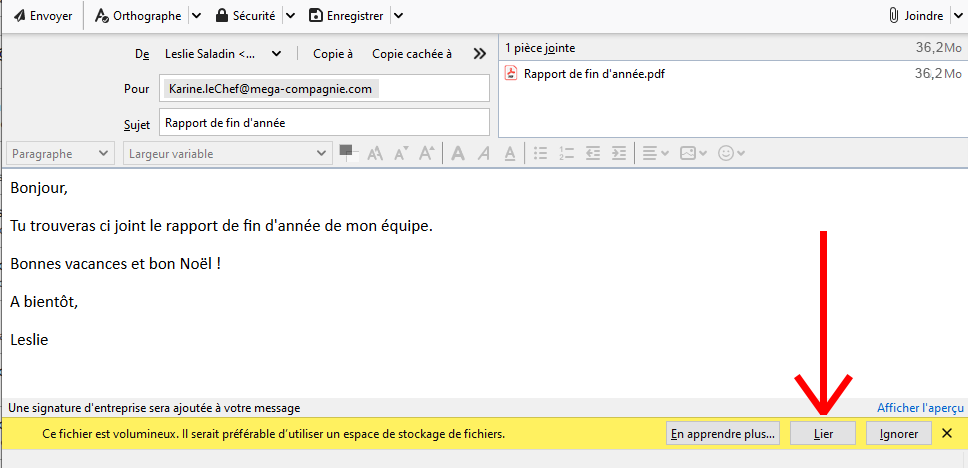 C’est la fin de l’année, vous bouclez les derniers dossiers et vous devez absolument envoyer le gros récap annuel à votre chef. Le gros récap qui compile toutes les données de l’équipe, les graphiques, les tableurs et les gros PDF avec tous les logos et les couleurs. Sylvie et Sébastien vous ont passé leurs éléments à la dernière minute, mais c’est bon, vous avez tout. Vous êtes dans les temps, il suffit d’envoyer le mail et vous serez en vacances !