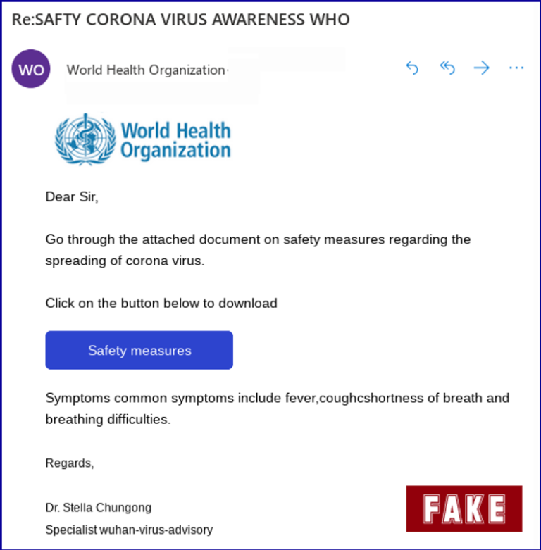 Dans le cadre de la pandemie, des cybercriminels ont adressé un mail à leurs victimes en se faisant passer pour l’OMS (Organisation Mondiale de la Santé), qui contenait un lien vers un prétendu document sur la prévention de la propagation du virus. En réalité, le lien redirigeait les victimes vers un domaine malveillant qui tentait de récolter des informations d’identification. Le courriel contenait plusieurs erreurs grammaticales et de format qui ont probablement mis la puce à l’oreille a la majorité de ceux qui l’ont reçu, mais d’autres – très nombreux – ont cliqué malgré tout (toutes les informations sur cette arnaque ici).
