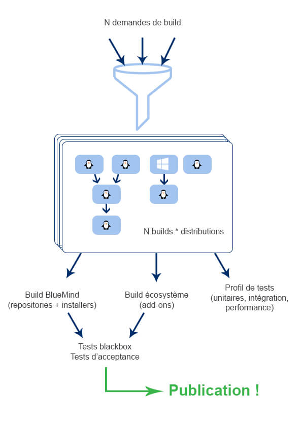 We use Jenkins to build and test our development branches (features or corrections) whose changes continuously integrate our release branches (3.0, 3.5, 4.0), on all supported Linux distributions (8 for BlueMind 3.5.9). The BlueMind core comprises more than 500 modules and interacts with many AddOns you can find at the Marketplace. These have also been built, tested and deployed through our continuous integration chain and are subject to the same compatibility and quality constraints. More than 3,000 tests are carried out on every build. Such a degree of complexity would be impossible to manage manually! What’s so clever about continuous integration is that tasks automatically run one after the other as we aim for process industrialisation.