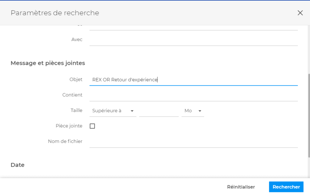 Les critères de recherche sont cumulatifs, ce qui signifie que vous pouvez combiner plusieurs options pour affiner au maximum vos résultats. Par exemple, vous pouvez rechercher tous les messages envoyés par un expéditeur donné, dont l’objet contient un mot-clé précis et qui ont été reçus au cours d’un mois donné.