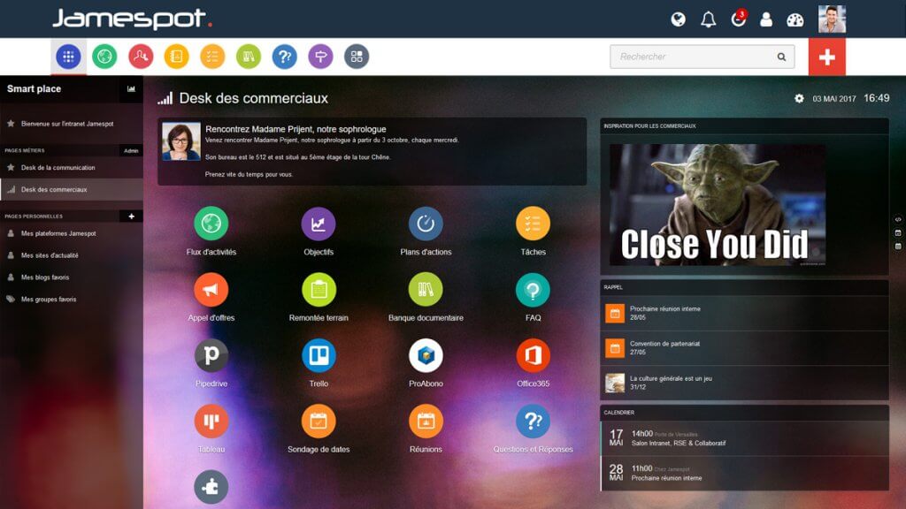 Grâce à Smart Place, l’organisation profite de toute l’intelligence collective et collaborative de Jamespot via des widgets synchronisés avec les applications du système (ex : mails, agendas, reminders, notifications, drives, etc.). Avec l’application mobile, emportez toute l’information professionnelle de votre Digital Workplace Jamespot.