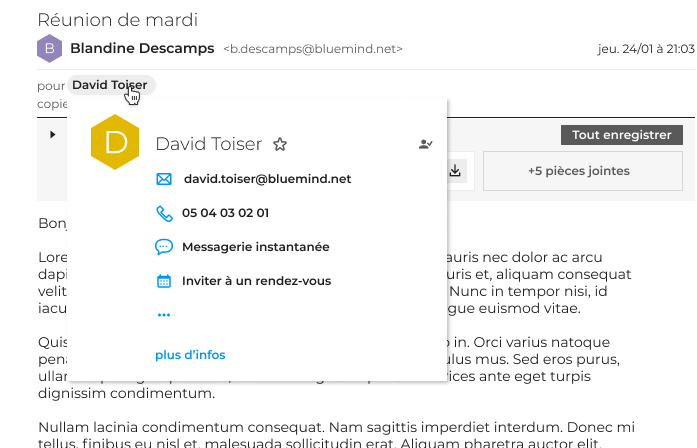 - Interactions entre applications : la multiplication des interactions entre les applications BlueMind, comme la gestion des événements de calendriers ou bien l’intégration des fiches de contact directement depuis la messagerie, permet une expérience sans cloisonnement. Cela est rendu possible grâce aux standards établis par l’API REST BlueMind et son accessibilité par n’importe quelle application.