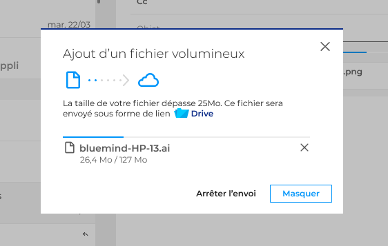 - Pièces jointes volumineuses : afin de permettre d’envoyer des documents volumineux (impossibles à transférer par mail en temps normal) sans changer les habitudes des utilisateurs le nouveau webmail offre également la fonctionnalité de détachement automatique de pièce jointe (selon critères). Cela permet d’alléger les serveurs de messagerie et les transferts en stockant les documents sur le Filehosting de BlueMind ou sur une application interfacée via l’API REST, comme le drive nextcloud ou Jalios.