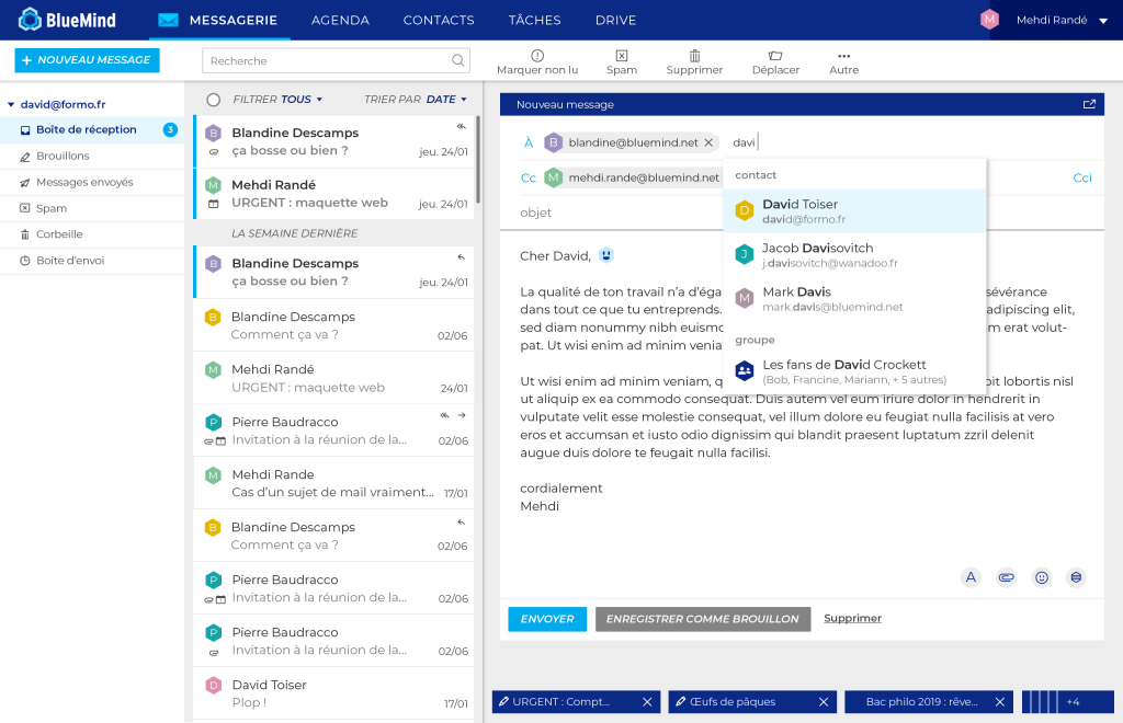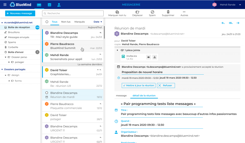 Vous retrouverez dans le webmail l’ensemble des fonctionnalités de BlueMind qui vous permettent de travailler aussi efficacement que sur un client lourd : gestion agréable, efficace et rapide de vos mails, dossiers, boites partagées et fonctionnelles, brouillons, recherches riches mais également la gestion des invitations et la recherche de disponibilité dans l’agenda, la gestion des signatures d’entreprise, la gestions des ressources de visio-conférence, le détachement automatique de pièces jointes volumineuses, les filtres etc.