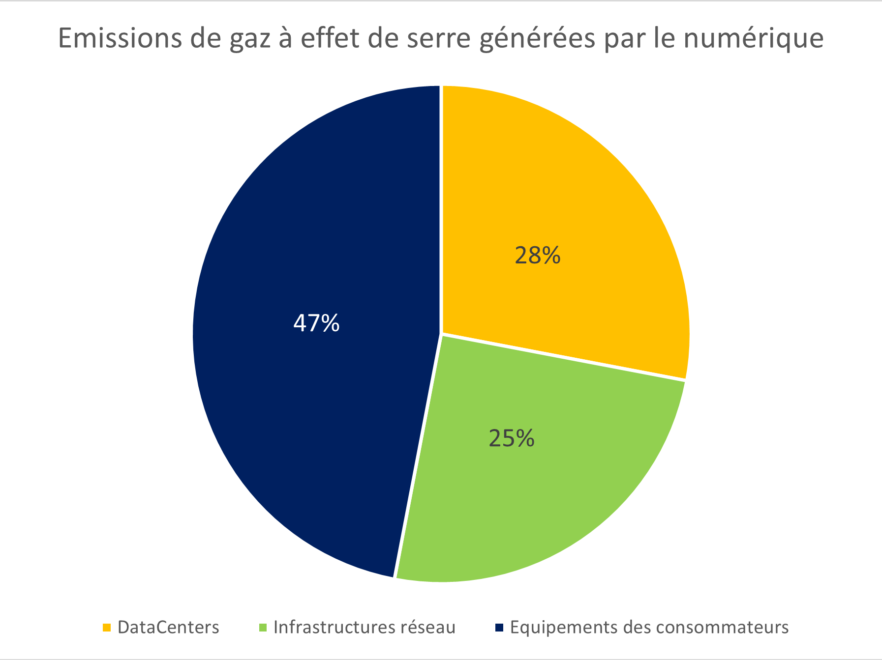 « La plupart des chiffres disponibles aujourd’hui établissent que le numérique serait à l’origine de 3,7 % des émissions totales de gaz à effet de serre (GES) dans le monde en 2018 et de 4,2 % de la consommation mondiale d’énergie primaire. 44 % de cette empreinte serait due à la fabrication des terminaux, des centres informatiques et des réseaux et 56 % à leur utilisation. » (Source : Sénat 2020)