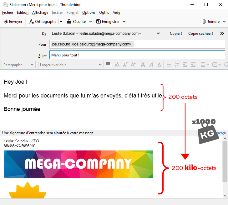 Malheureusement le poids des emails est en augmentation constante. Initialement il se composait de texte simple pesant à peine quelques octets ou kilo-octets. Avec le HTML, il est devenu plus riche et donc plus lourd (quelques kilo-octet ou dizaine de kilo-octet), mais c’était encore raisonnable. En revanche, avec la généralisation des images l’email est tombé dans l’obésité morbide. Les signatures se mettent à peser des dizaines, des centaines, voir des milliers de fois plus que le corps du mail en lui-même.