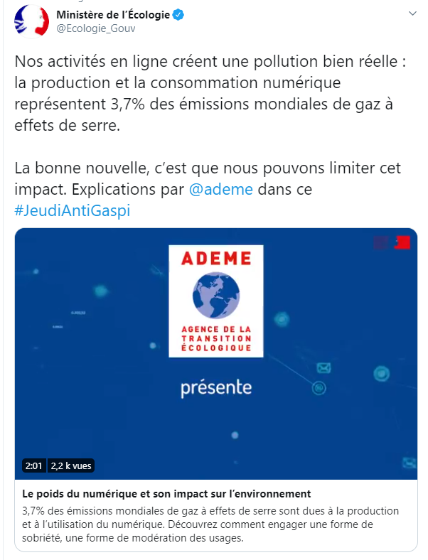 Le 24 juin 2020, en pleine pandémie, la commission de l’aménagement du territoire et du développement durable a remis son rapport au Sénat : « Pour une transition numérique écologique ». L’objectif de cette commission était de « mesurer l’empreinte environnementale du numérique en France, d’évaluer l’évolution de cet impact dans les prochaines années et de formuler des pistes d’action pour les politiques publiques concernées, afin d’engager notre pays dans une transition numérique écologique, c’est-à-dire compatible avec les objectifs de l’accord de Paris de lutte contre le réchauffement climatique ».