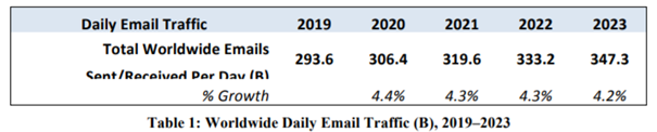 Même si les outils de visio ont eu le vent en poupe pendant les confinements successifs, c’est bien toujours l’email qui domine de très loin le palmarès des outils de communication en entreprise. Selon les projections de Radicati il s’en serait échangé 306.4 milliards par jour dans le monde en 2020 (projection établie avant la pandémie).