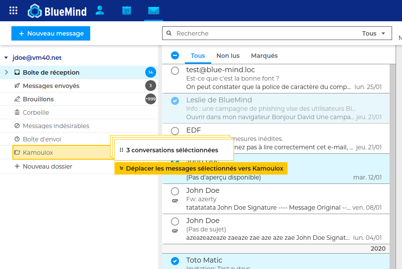 Le webmail de BlueMind a été conçu en repartant de 0 par notre équipe UX pour vous offrir la meilleure expérience d’utilisation possible. Il utilise les technologies web récentes, cible l’ergonomie et expérience d’un client lourd et propose déjà tout un panel de fonctionnalités et avantages : détachement de PJ, signatures professionnelles, dossiers faciles, accessibilité, intégration d’aperçus agendas pour aide à la décision lors d’invitations par mail, etc. ainsi qu’un « mode conversation » pour simplifier la gestion des échanges dans votre boite de réception.