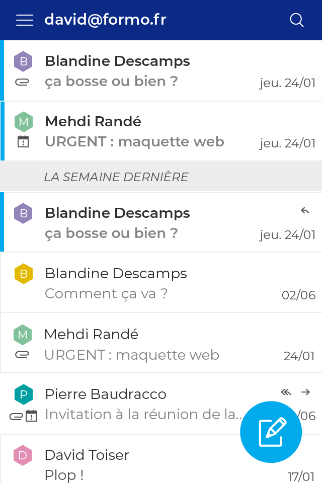 Le mode déconnecté, déjà disponible dans l’agenda et les contacts, est enfin disponible pour les mails : vous êtes dans l’avion, vous avez 2h de vol à tuer ou dans un train avec un accès 4G clignotant. C’est l’occasion de préparer votre prochaine réunion ! Mais pour cela il vous faut pouvoir accéder à tous les échanges mails précédents sur le sujet, et permettre de rédiger un brouillon, le tout sans connexion internet et sans client lourd. C’est ce que permet le nouveau webmail et l’architecture web globale de BlueMind.